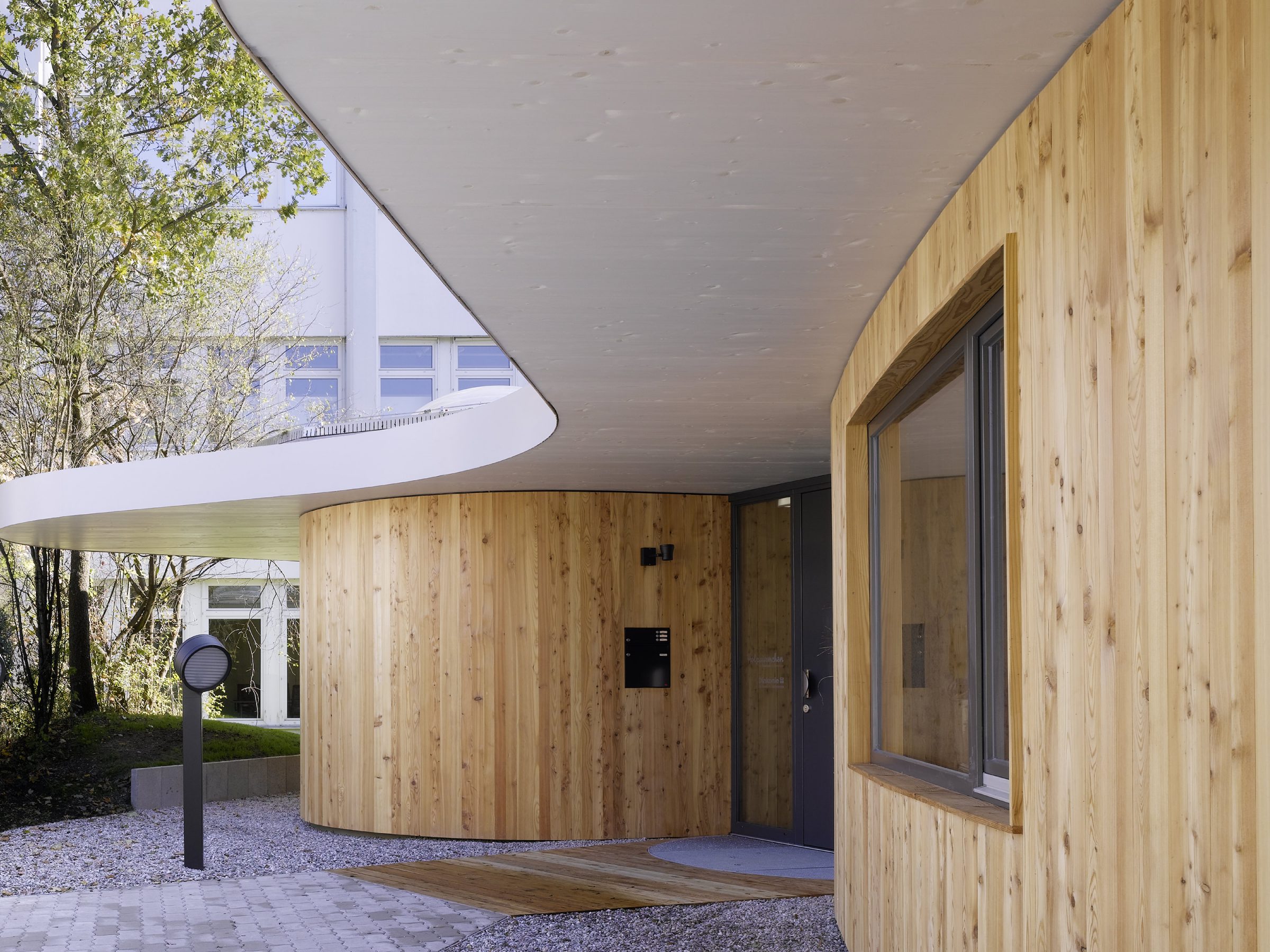Eine Betriebs Kita im Industriegebiet als architektonische Gegenwelt. Eingeschossige kieselartige Gruppen- und Funktionsräume um das zentrale Forum werden vom amorph geschwungenen Dach gefasst. Holz ist das dominierende Material, Licht und Plastizität verstärken den Ausdruck.